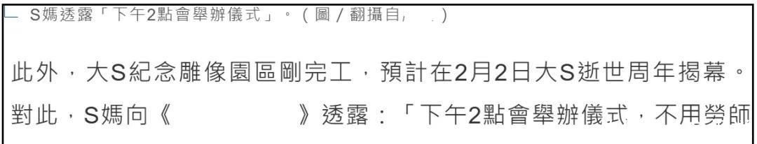 大S逝世一周年纪念活动定于2月3日下午十四时整举行,地点位于台北近郊某静谧园林式灵堂;