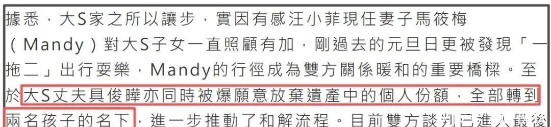 具俊晔继承份额中的全部不动产及现金资产,将依法转入大S与汪小菲所育一双子女名下,由汪小菲担任法定监管人并设立专项信托账户。